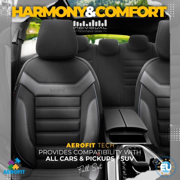 Sitzbezüge Komplettset für Autos Premium Öko-Leder und Textil mit Rot Ziernähten Lux Otom Schwarz INDIVIDUAL Design